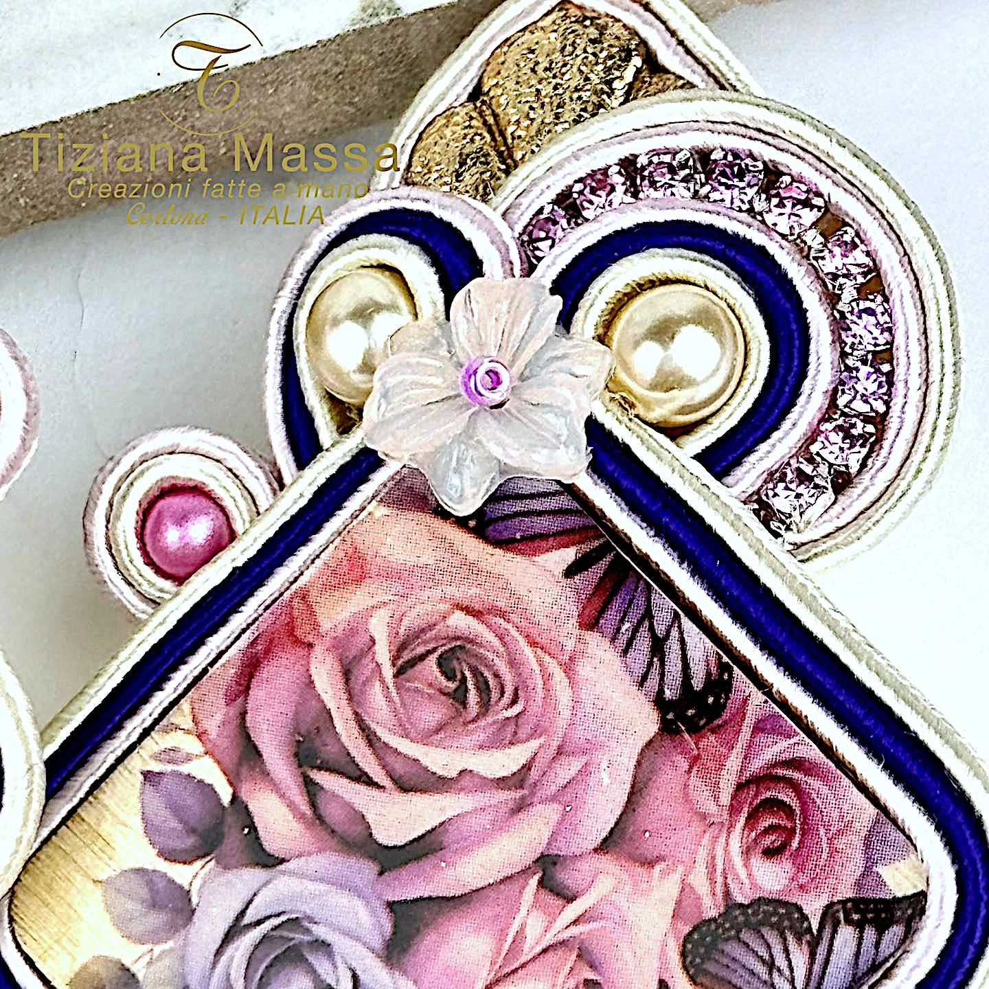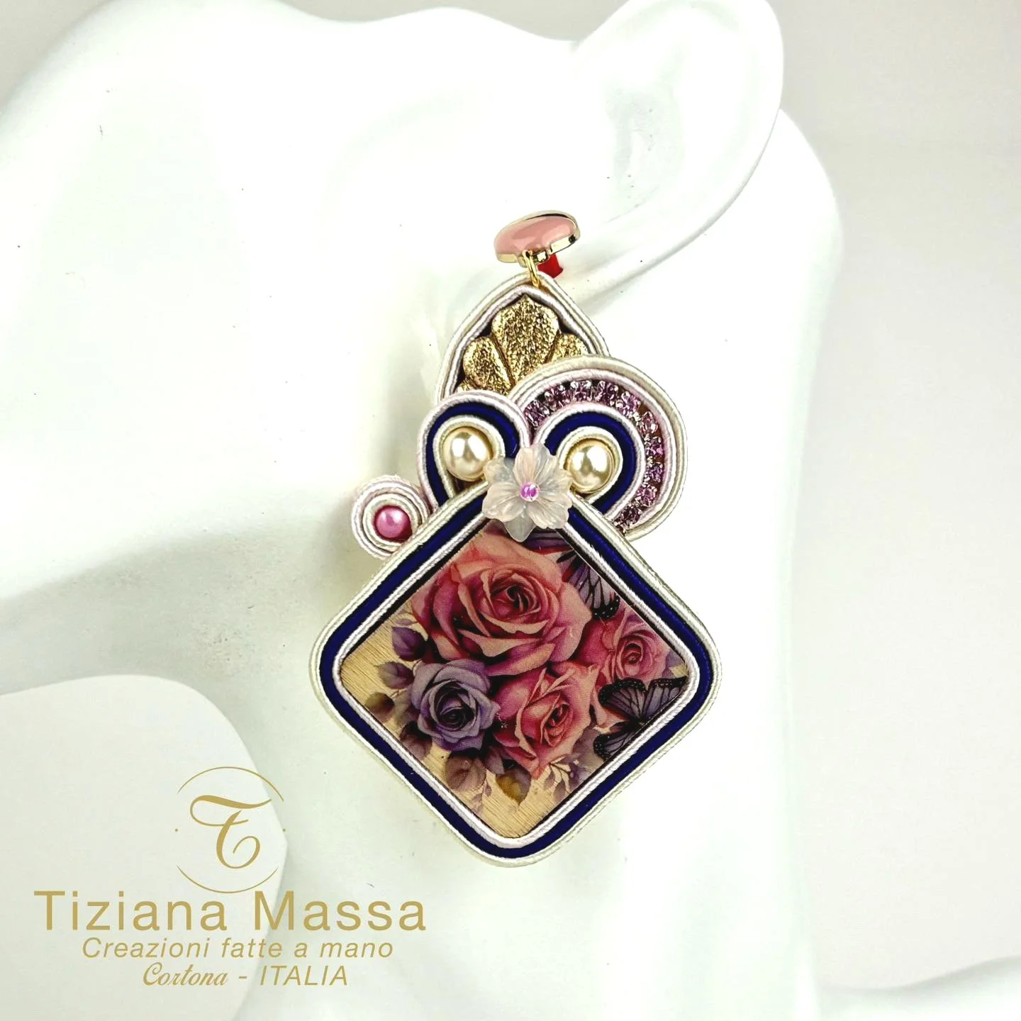 Eleganti orecchini quadrati realizzati a mano con tecnica a soutache che unisce raffinatezza e originalità. Ogni pezzo è composto da cabochon di alta qualità, splendidamente incorniciati dalla treccia russa. Il design è impreziosito da un cabochon stampato con un mazzo di rose rosa simbolo di amore e bellezza, che completa l'aspetto sofisticato e delicato di questi orecchini. La combinazione di materiali preziosi e la cura nei dettagli garantiscono che ogni paio di orecchini sia unico, riflettendo un'eleganza senza tempo.
