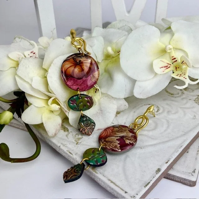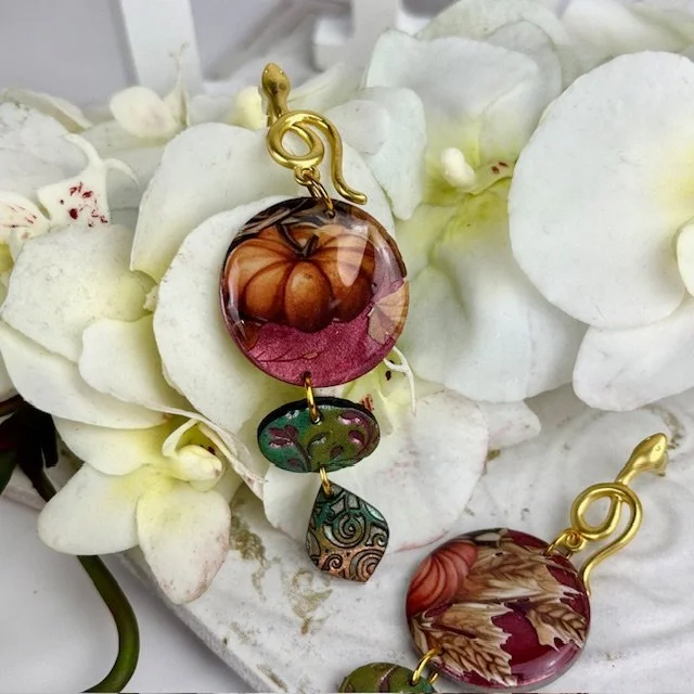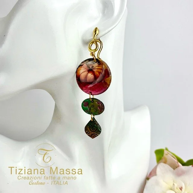 Piccoli quadri d’autunno da indossare: cabochon artigianali trasformati in orecchini pendenti unici. Un tocco magico e raffinato per vivere Halloween con eleganza e femminilità.