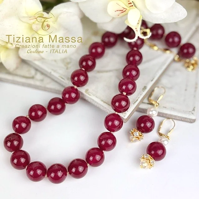 Parure in giada rosso rubino, composta da girocollo e orecchini, realizzata a mano con cura e precisione.